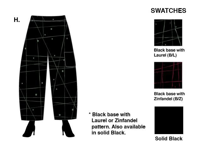 We know… it’s fall and winter time, but this pant sells year round, so pull out your little booties and give it a try. We’re offering it in black AND in black based pattern (with zinfindal or laurel pattern). Yoga waist for comfort, rounded leg for style, cropped because it’s cool and one front thigh pocket just because. 36” outseam.